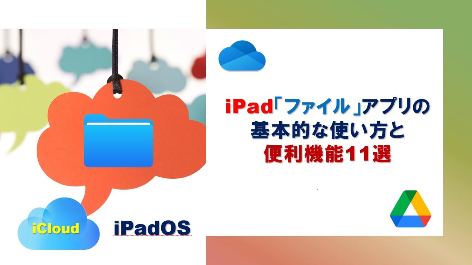 ストレージ(場所)は、iPad端末内とクラウド上のiCloud Driveだけでなく、Apple以外のGoogleドライブやOneDriveなどのクラウドストレージサービスとも連携することができます。